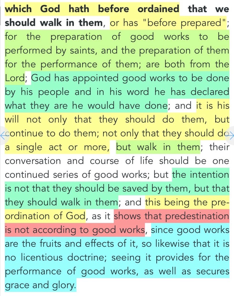 It is interesting in reading old John Gill’s commentary, (which you can see I’ve over highlighted).…I noted Gill clearly states that our predestination (aka our Salvation) is not according to good works. And there is no contradiction or inconsistency in the doctrines of Salvation and Works taught in the Bible. Elsewhere I’ve observed with careful reading Paul, Peter and James do in fact say the same thing.